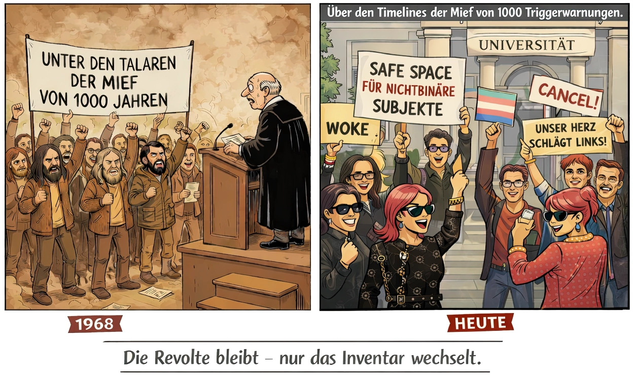 Der sogenannte „Marsch durch die Institutionen“ zeigt sich nicht nur bei Studierenden, sondern zunehmend auch im Lehrkörper. Zwei Mechanismen wirken hier zusammen: demografische Verschiebungen und Anpassungsdruck durch politische Korrektheit.