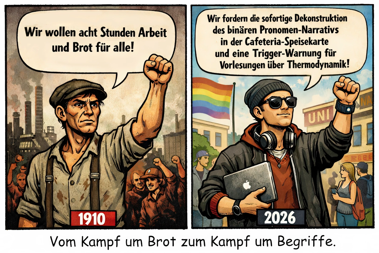 Ein Blick in die Vergangenheit zeigt, dass sich die heutige akademische Linke fundamental von der klassischen Arbeiterbewegung unterscheidet. Während historische linke Bewegungen primär ökonomische Ungleichheit thematisierten, fokussiert sich das zeitgenössische linke Milieu an Hochschulen auf kulturelle und identitäre Fragestellungen, die häufig unter den Begriffen „Identitätspolitik“ oder „Wokeness“ zusammengefasst werden.