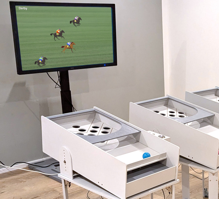 Der Nachbau setzt eine CNC‑Fräse oder einen Lasercutter voraus. „Derby“, auch als „Roll‑a‑Ball“ bekannt, ist ein Geschicklichkeitsspiel, bei dem mehrere Spieler gegeneinander antreten. Ziel ist es, Kugeln in Löcher auf einem Spielfeld zu werfen, wobei die Löcher unterschiedliche Punktwerte besitzen. Je nach Treffer bewegen sich die Spielfiguren auf einer Rennbahn vorwärts. Ein Treffer in ein höherwertiges Loch bringt das Pferd schneller voran – was Geschick und Präzision erfordert. Der Spieler, dessen Pferd zuerst das Ziel erreicht, gewinnt das Rennen. Statt einer mechanischen Rennbahn zeigt ein großer Bildschirm das Rennen an.