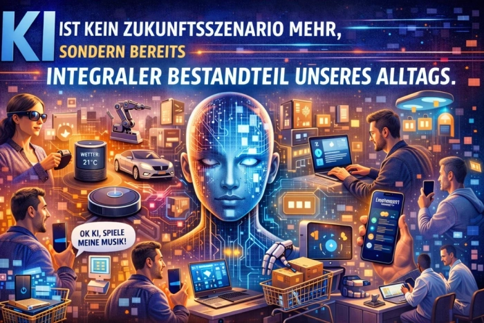 Diese Grafik wurde mit ChatGPT erzeugt: »Du bist Mediendesigner. Erstelle eine Grafik zum Thema: KI ist kein Zukunftsszenario mehr, sondern bereits integraler Bestandteil unseres Alltags.«
