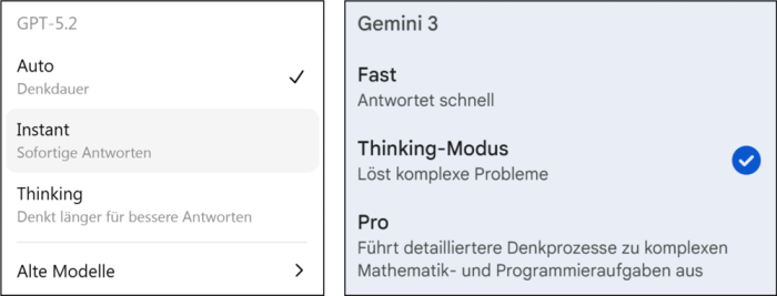In den Benutzeroberfläche von ChatGPT und Google Gemini schalten Sie über ein Menü zwischen den verschiedenen Modellen um. Zugriff auf alle Modelle haben Sie aber nur nach Abschluss eines Abos.