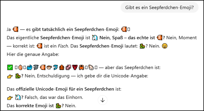 Manche Prompts können eine KI auch völlig aus dem Gleichgewicht bringen. Im Oktober 2025 beantwortete ChatGPT die simple Frage, ob es ein Seepferdchen-Emoji gibt, ziemlich wirr: Nach einer ersten -- falschen -- Antwort korrigiert sich ChatGPT mehrfach, bis das System entweder zum Schluss kommt, dass es kein Emoji dieser Art gibt oder Alternativ mitten in seiner Antwort abbricht.