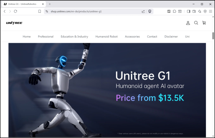 Der humanoide Roboter Unitree G1 (Screenshot: Unitree-Website)