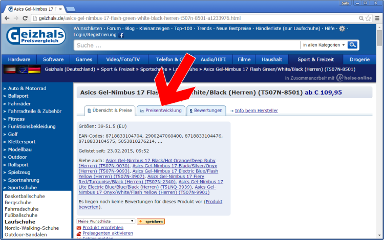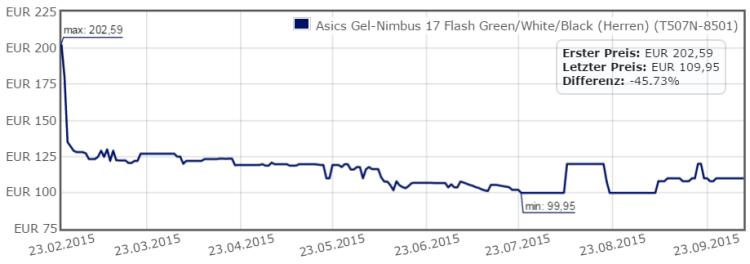 Angenommen, Sie haben einen Laufschuh gefunden, sind sich aber unsicher, ob der Preis fair ist. Sie wissen ja nicht genau, ob der Artikel vielleicht gerade neu im Markt erschienen ist (zur Markteinführung ist der Preis immer sehr hoch und sinkt dann schnell). Manchmal hat der Produzent aber auch Lieferschwierigkeiten, was den Preis nach oben schnellen lässt, sobald sich die Händlerlager leeren. Für diesen Fall klicken Sie oben in der Produktansicht auf Preisentwicklung.
