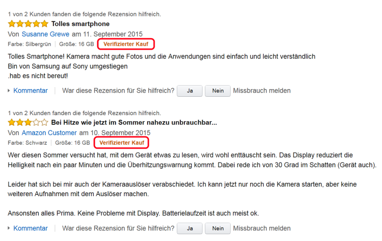 Im Prinzip darf jeder Produktbewertungen auf Amazon erfassen -- vorheriges Anlegen eines Kundenkontos reicht aus. Deshalb ist es auch schon einige Male vorgekommen, dass Hersteller positive Rezensionen zu ihren eigenen Produkten verfasst haben und negative über die der Wettbewerber. Etwas Sicherheit bietet der Hinweis »Verifizierter Kauf«, der darauf hinweist, dass der Kunde den bewerteten Artikel bei Amazon erworben hat.