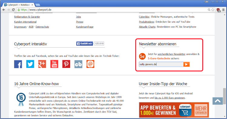 Sie finden einen Link auf das Newsletter-Abo beziehungsweise ein Eingabefeld für Ihre E-Mail-Adresse auf der Startseite des jeweiligen Online-Shops, im Beispiel Cyberport (www.cyberport.de). Neu-Abonnenten erhalten hier einen Gutschein-Code über 5 Euro, den sie beim nächsten Kauf einlösen können.
