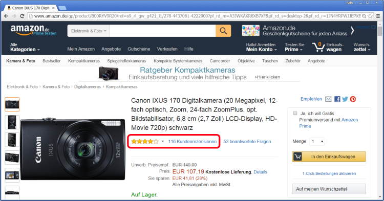 Eine Alternative zu den Produkttests sind unabhängige Kundenbewertungen. Hier ist besonders Amazon (www.amazon.de) interessant. Geben Sie zum Beispiel im Suchfeld am oberen Bildschirmrand »digitalkamera« ein, wenn Sie sich eine neue Kamera zulegen möchten, worauf der Marktplatz zusammen mit den Produkten auch deren Kundenbewertung (Markierung) auflistet. Klicken Sie davon einmal ein Produkt beziehungsweise Produktfoto an.