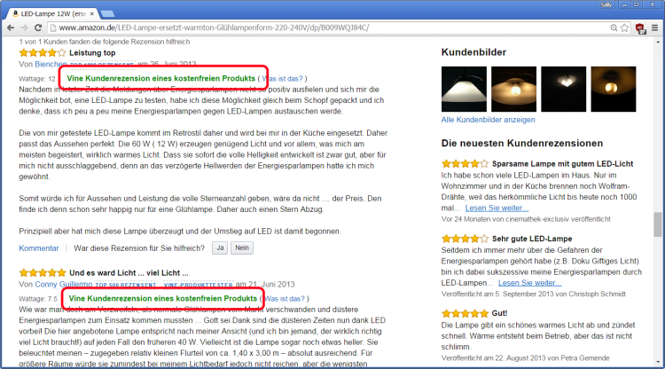 Vorsicht ist geboten bei Bewertungen, die den Hinweis »Vine Kundenrezension eines kostenfreien Produkts« tragen (Markierung). Im Rahmen von Amazon Vine (weitere Infos unter www.amazon.de/gp/vine/help) erhalten bestimmte Personengruppen vorab von den Herstellern Produkte, zu denen sie dann Bewertungen abgeben. Weil die Tester in der Regel die Ware anschließend behalten dürfen, ist deren Motivation, positive Rezensionen abzuliefern sehr hoch, zumal sonst der Entzug des profitablen Vine-Status drohen könnte.