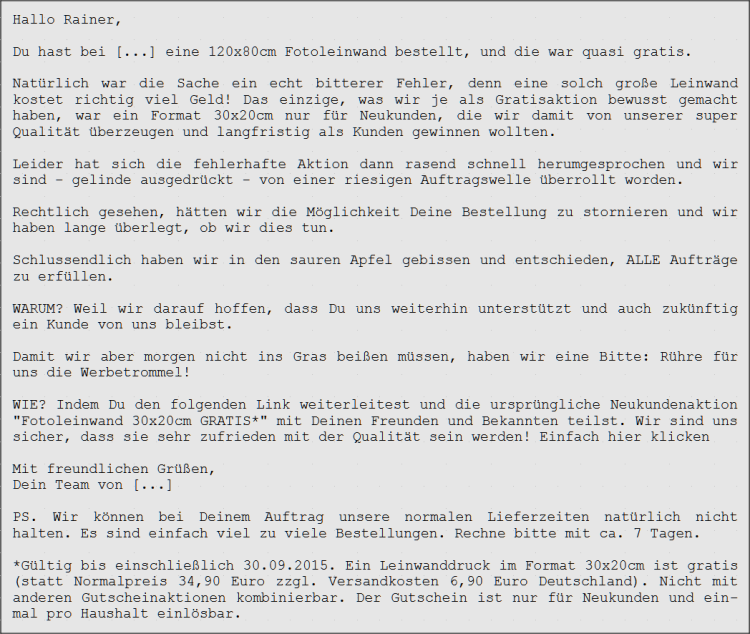 Souveräne Reaktion eines Fotodruck-Anbieters bei dem der Autor dank eines bei MyDealz publizierten Gutscheinfehlers eine 120 × 80 cm große Leinwand für nur 10 statt für 150 Euro bestellen konnte.