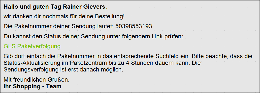 Die meisten Händler halten Sie per E-Mail über den Bestell- und Lieferstatus auf dem Laufenden. In diesem Fall lässt sich der Liefertermin mit einem Klick auf GLS Paketverfolgung nachvollziehen. Als berufstätige Person nehmen Sie sich einfach am avisierten Liefertag frei.