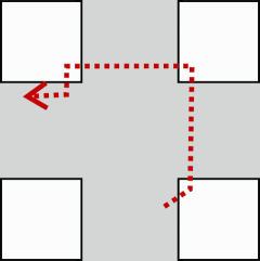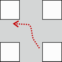 Beim indirekten Abbiegen fahren Sie zunächst geradeaus weiter bis in die Gegenfahrbahn und biegen dann mit rechten Winkel ab.