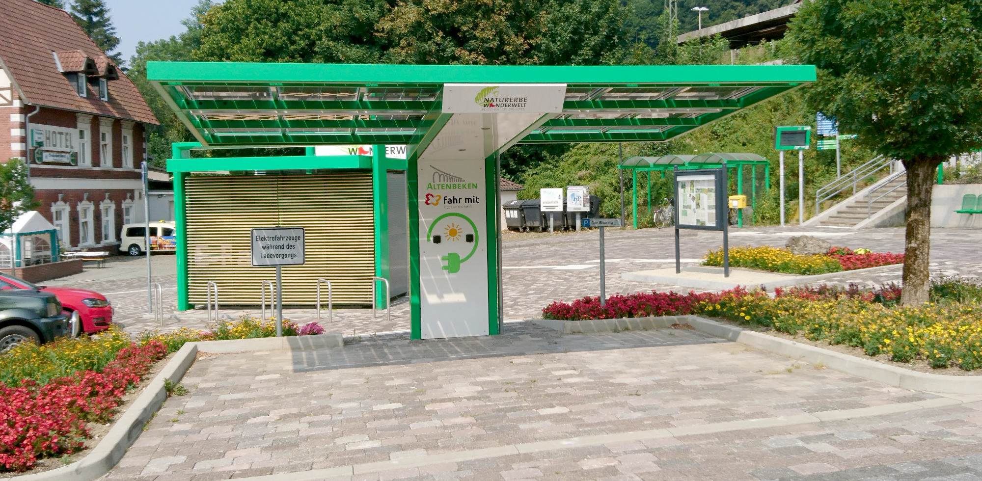 Einige Ladestationen, hier am Bahnhof von Altenbeken bei Paderborn, sind sehr luxuriös mit Überdachung und für Elektrofahrzeuge reservierten Parkplätzen ausgestattet.