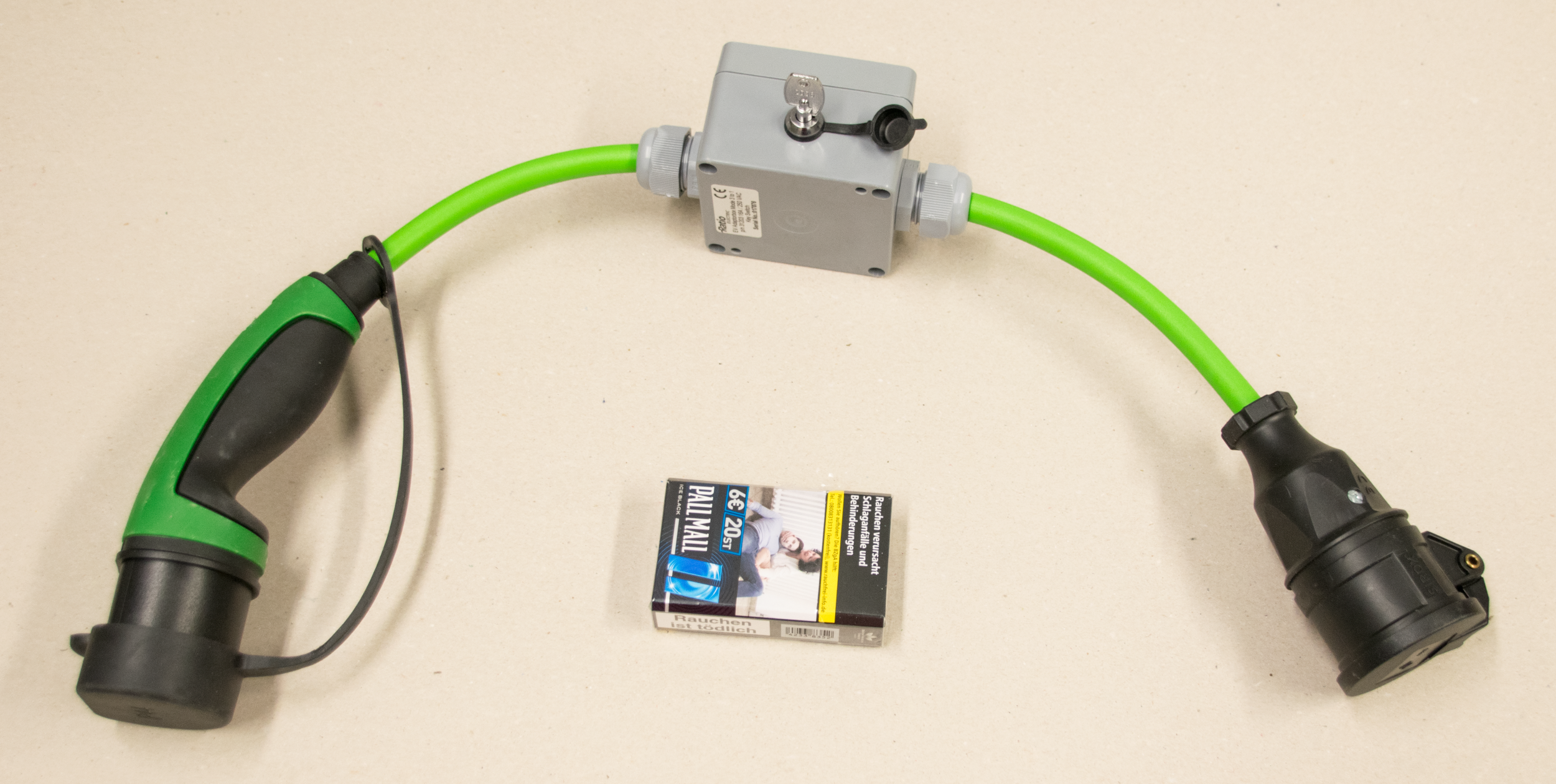Typ 2 auf Schuko-Adapter mit einer Zigarettenschachtel als Größenvergleich. Über einen Schlüsselschalter (oben in der Mitte) wird eine elektrische Verriegelung des Typ 2-Steckers in der Ladesäule aktiviert. Erst danach ist das Laden möglich.