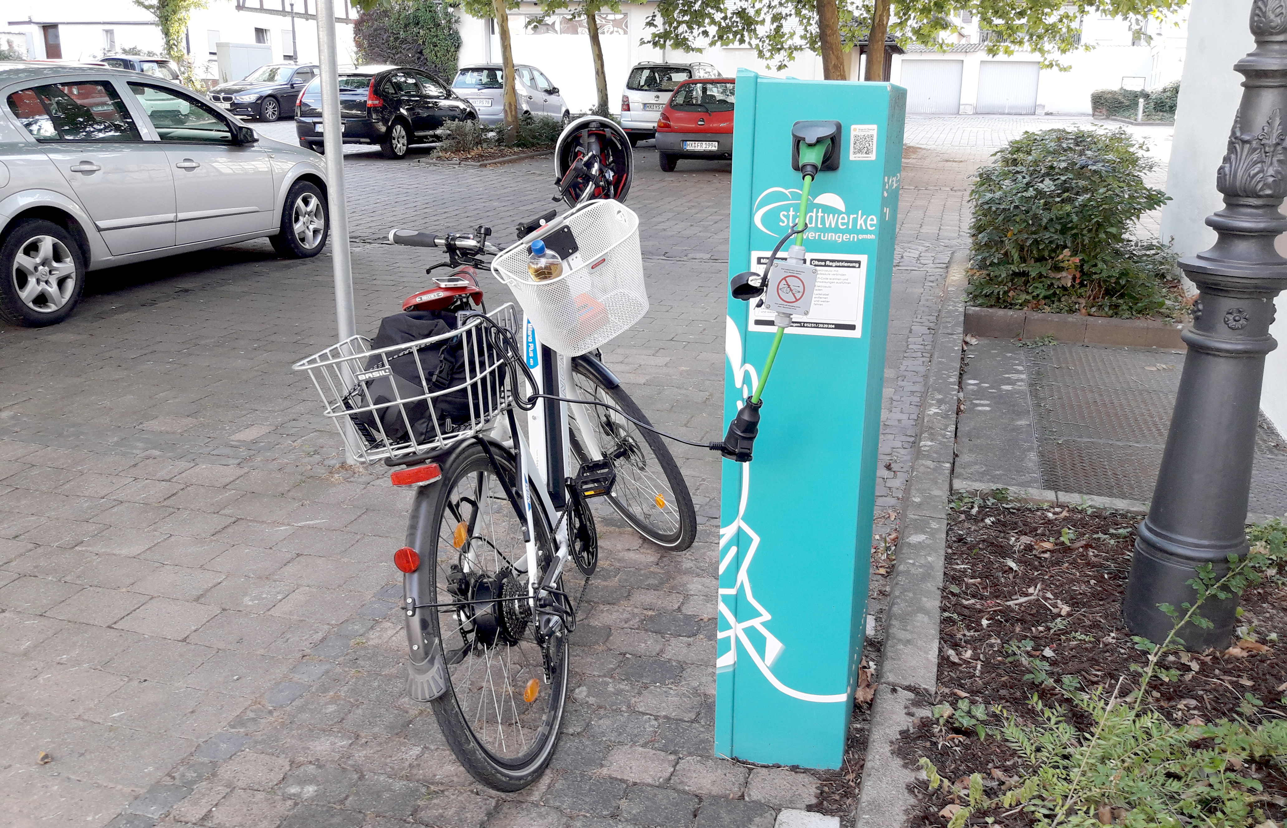 Sieht für Außenstehende gewöhnungsbedürftig aus: Das Pedelec lädt über einen Typ 2-nach-Schuko-Adapter an der Elektroautoladesäule.