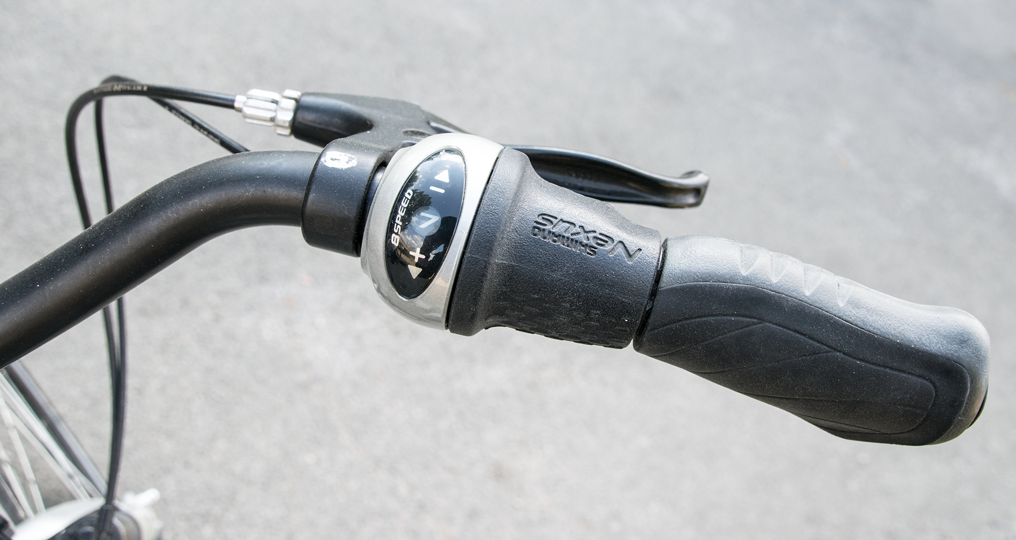 Der Gangwechsel erfolgt bei der Nabenschaltung -- hier eine Shimano Nexus -- über einen Drehschalter.