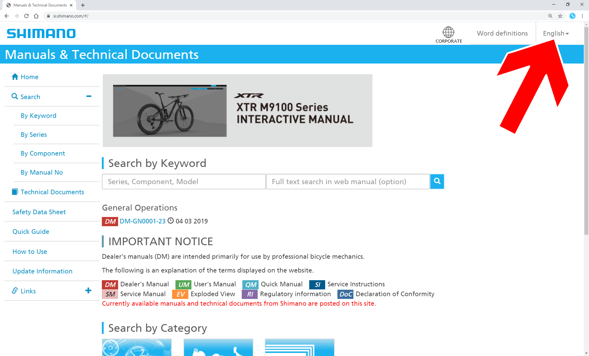Ausführliche Wartungs- und Bedienungsanleitungen stellt der Schaltungshersteller Shimano unter der Webadresse si.shimano.com bereit. Die Benutzeroberfläche sollten Sie oben rechts auf Deutsch (Pfeil) umstellen, damit Ihnen die Suchfunktion deutschsprachige Dokumente auswirft.