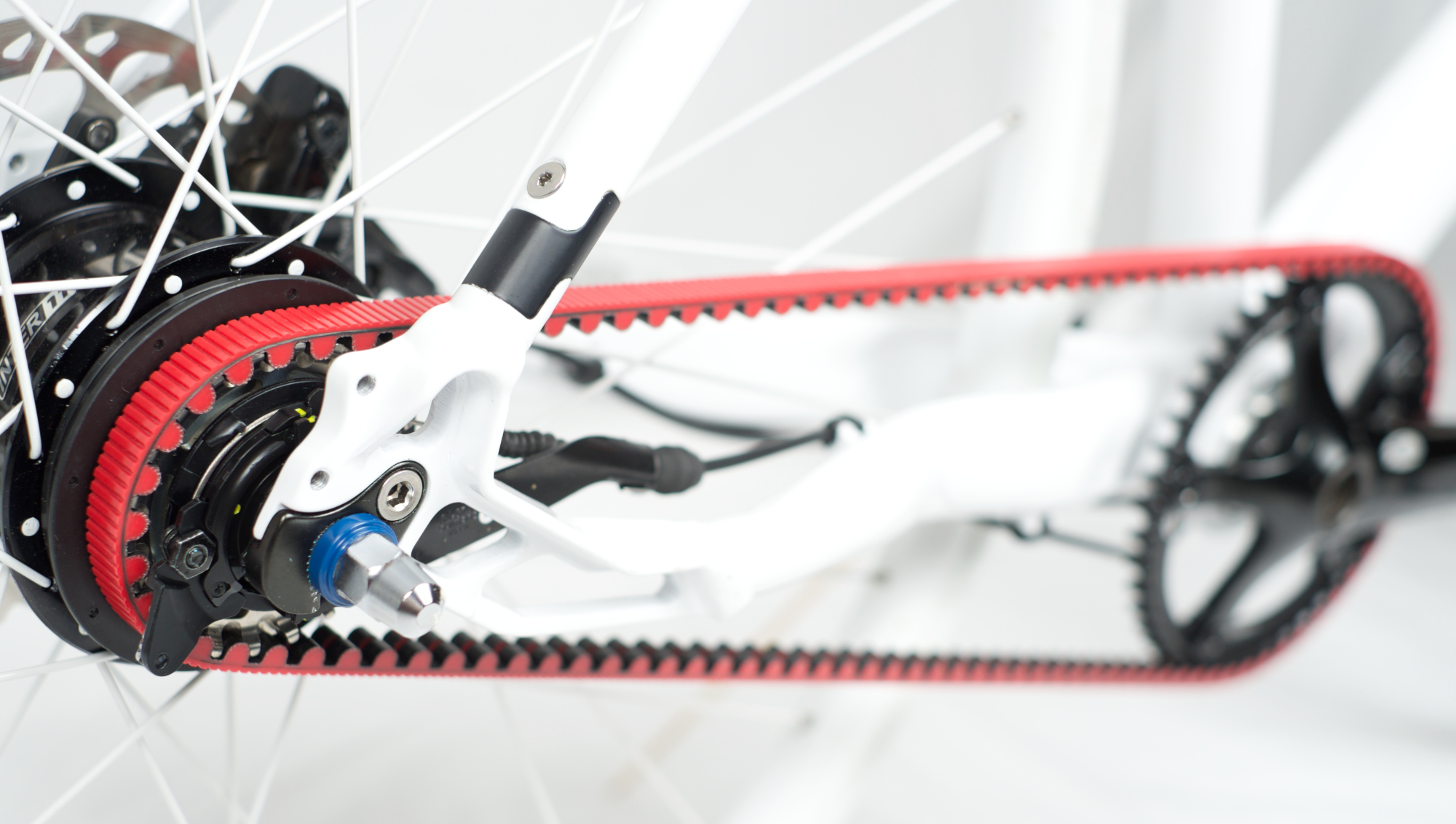 Riemenantrieb mit Gates-CDX-Carbonriemen. Deutlich ist die Nut im Riemen zu sehen, die das Abspringen des Riemens verhindert. Foto: www.pd-f.de / gatescarbondrive.com