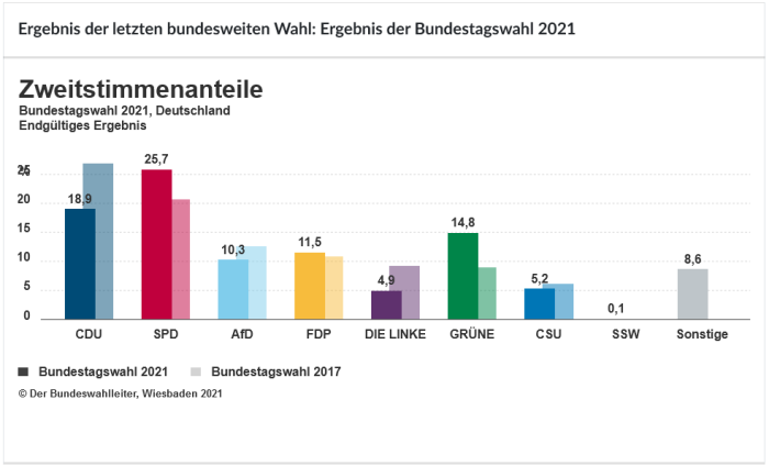 Bei der Bundestagswahl 2021 konnten die Grünen mit 14,8 Prozent eine ausgezeichnetes Ergebnis aufweisen, der zur Regierungsbeteiligung führte3.