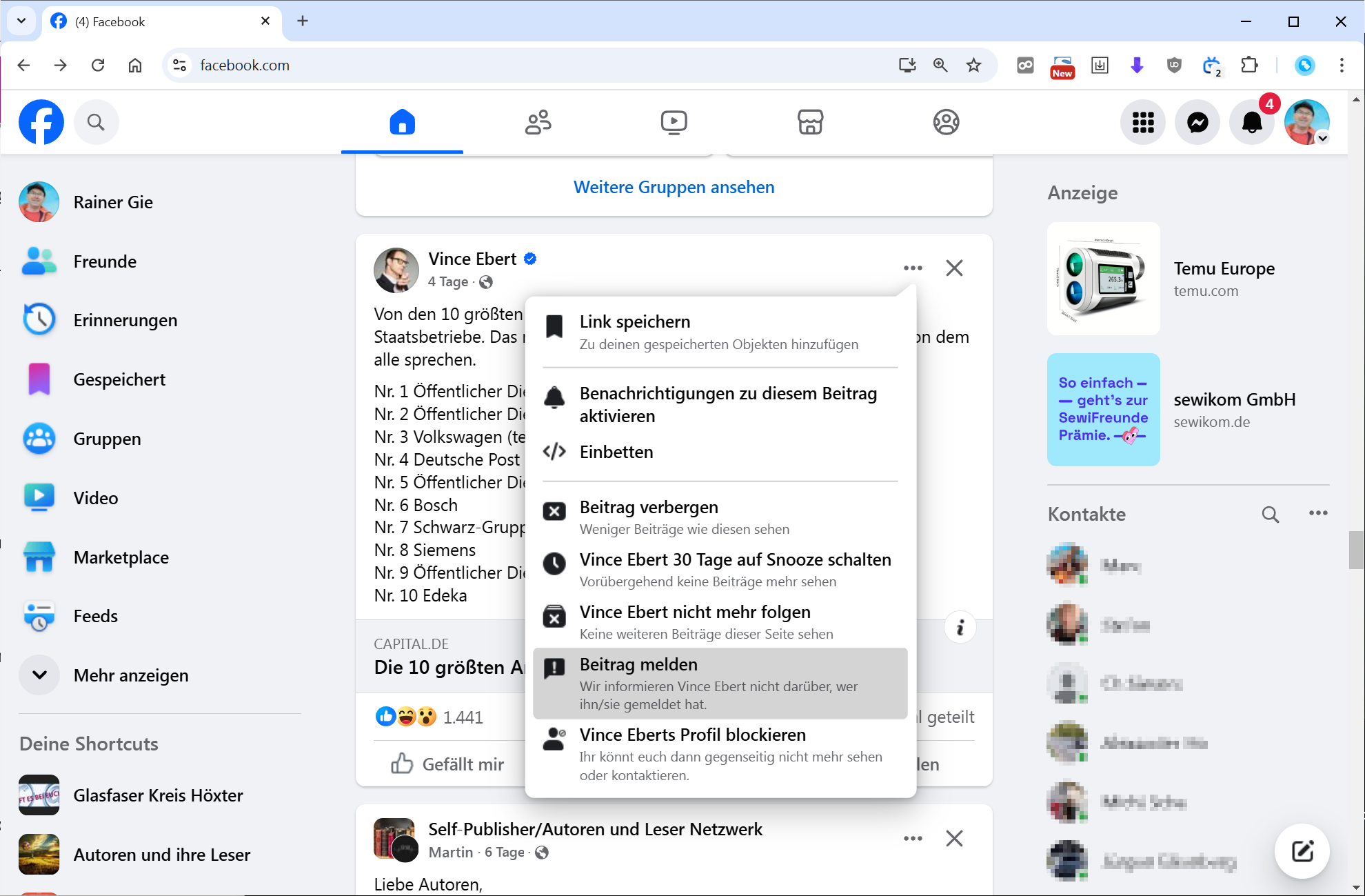Über eine Schaltleiste können Sie bei zum Beispiel auf Facebook einen Beitrag melden, von dem Sie ausgehen, dass er gegen Gesetze verstößt.