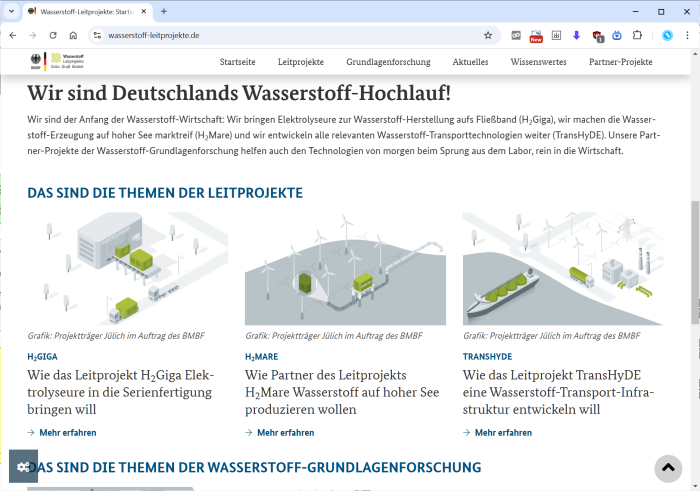 Das Bundesministerium für Bildung und Forschung hat eine Website eingerichtet, auf der Sie Informationen zu den Wasserstoffprojekten finden7.