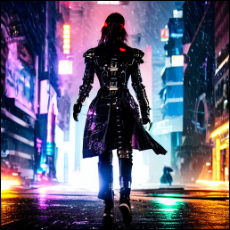 »A female cyberpunk cyborg with glowing neon accents, intricate mechanical details, wearing a futuristic black trench coat, standing in a rain-soaked city street at night, cinematic lighting, 8k«