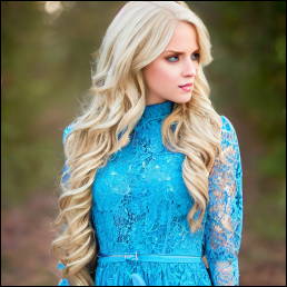 »A photorealistic portrait of a young woman with long, flowing blonde hair and striking blue eyes, wearing a delicate lace dress. Soft natural lighting, detailed skin texture, 8K, sharp focus«
