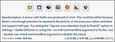 Falls kein Bild generiert wurde, überprüfen Sie, ob die Weboberfläche eine Fehlermeldung ausgeworfen hat. Diese finden Sie unterhalb der Stelle, an der das fertige Bild erscheinen sollte. Geben Sie die Fehlermeldung in Google ein, um eine mögliche Lösung für das Problem zu finden. In unserem Beispiel ist die Grafikkarte offenbar nicht leistungsfähig genug (»... or because your video card does not support half-type«).