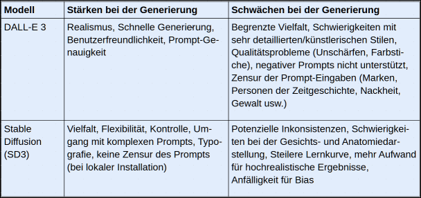 Ein Vergleich der Bildqualität mit DALL-E zeigt, dass Stable Diffusion standardmäßig zu eher fotorealistischen Bildern neigt, während DALL-E 3 tendenziell abstraktere oder computergenerierter wirkende Bilder erzeugt. Durch gezieltes Prompting lässt sich allerdings mit beiden KI-Modellen ein breites Spektrum an Stilen realisieren.