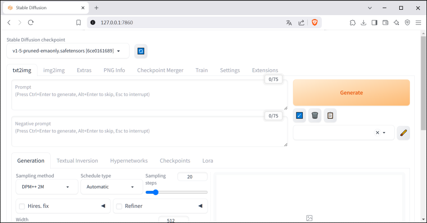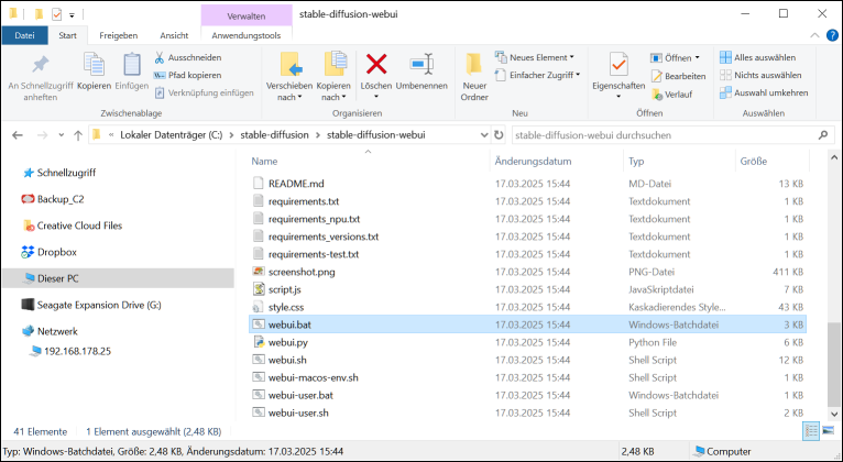 Starten Sie die SD-Weboberfläche durch einen Doppelklick auf webui.bat im Verzeichnis C:\stable-diffusion\stable-diffusion-webui.