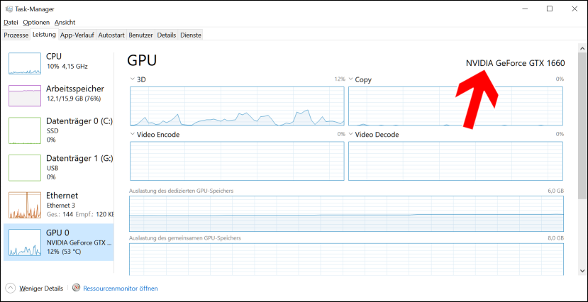 Auf diesem PC kommt eine NVDIA GeForce GTX 1660 mit 8 GB (wird unten rechts angezeigt) zum Einsatz.