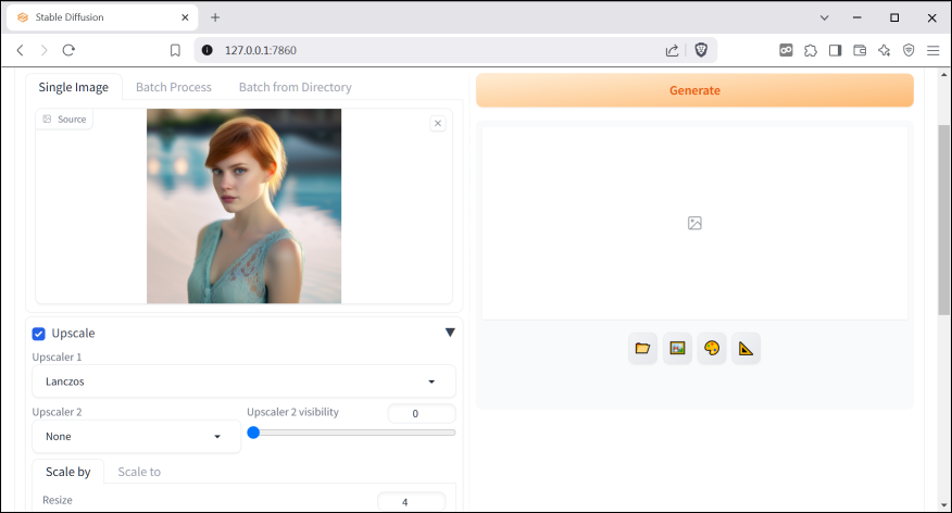 Die Bildskalierung erfordert ein präzises Verständnis der verfügbaren Parameter im Extras-Register, um qualitativ hochwertige Ergebnisse zu erzielen. Stellen Sie die unten vorgestellten Parameter ein und betätigen Sie Generate.