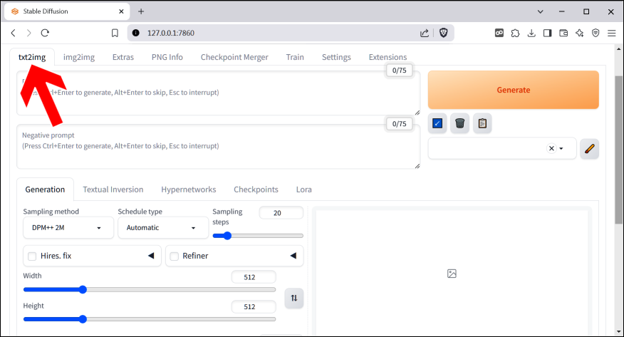 Die Eingabefelder beziehungsweise Parameter im txt2img-Register gliedern sich in folgende Gruppen: