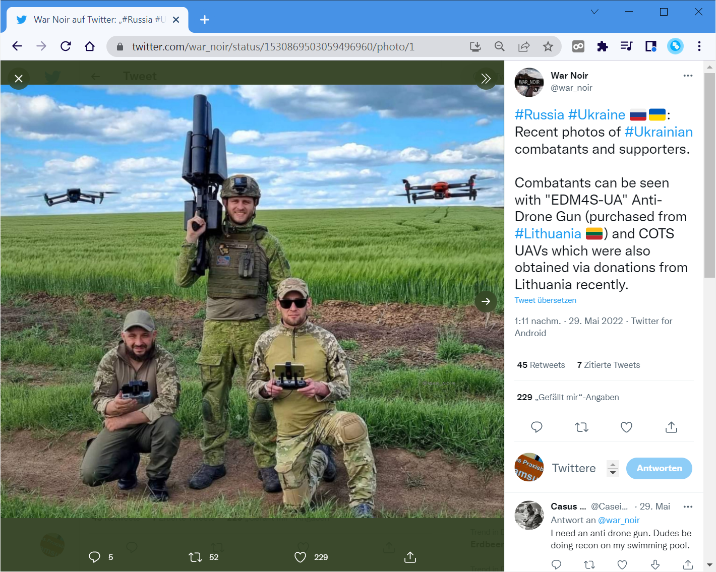 Gegenmaßnahme: Im Dezember 2021 erhielt die ukrainische Armee aus Litauen erstmals 10 EDM4S-UA, mit der sich gegnerischen Drohnen durch Störsignale abschießen lassen33. Die »Waffe« (vom Soldat in der Bildmitte gehalten) sieht aus wie ein Requisit aus einem Science Fiction-Film. Im Juni 2022 wurden mindestens 110 weitere Drohnen-Störsender in Litauen bestellt34. Auch ein Video ist aufgetaucht, das eine russische Drohne zeigt, die von ukrainischen Soldaten mit einem der EDM4S-UA-Störsender zum Landen gezwungen wird35.