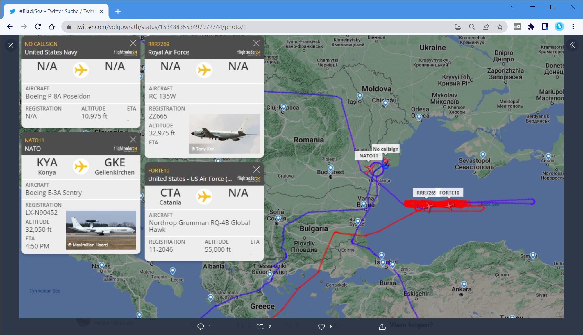 Regelmäßig sind Aufklärungsflugzeuge und Drohnen der Nato-Mitglieder in der Nähe der Landesgrenzen von Russland und Ukraine unterwegs72. Weil alle Flugzeuge per Funk eine eindeutige Kennung senden, lassen sich ihre Bewegungen nachvollziehen. Inwieweit ihre Sensordaten auch der Ukraine zur Verfügung gestellt werden, ist unbekannt.\