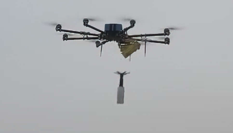 Dieser R18-Octocopter der Drohnen-Einheit lässt während einer Demonstation die mitgeführte Granate fallen24.