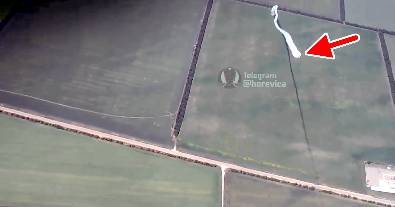 Seltenes Schauspiel: Eine ukrainische Drohne hatte erfolgreich an der Ausrichtung von ukrainischem Artilleriefeuer auf russische Fahrzeuge mitgewirkt, wurde aber kurz danach von einer gegnerischen Boden-Luft-Rakete vom Himmel geholt. Im Bild sieht man die Rauchspur der nahenden Rakete18 19.