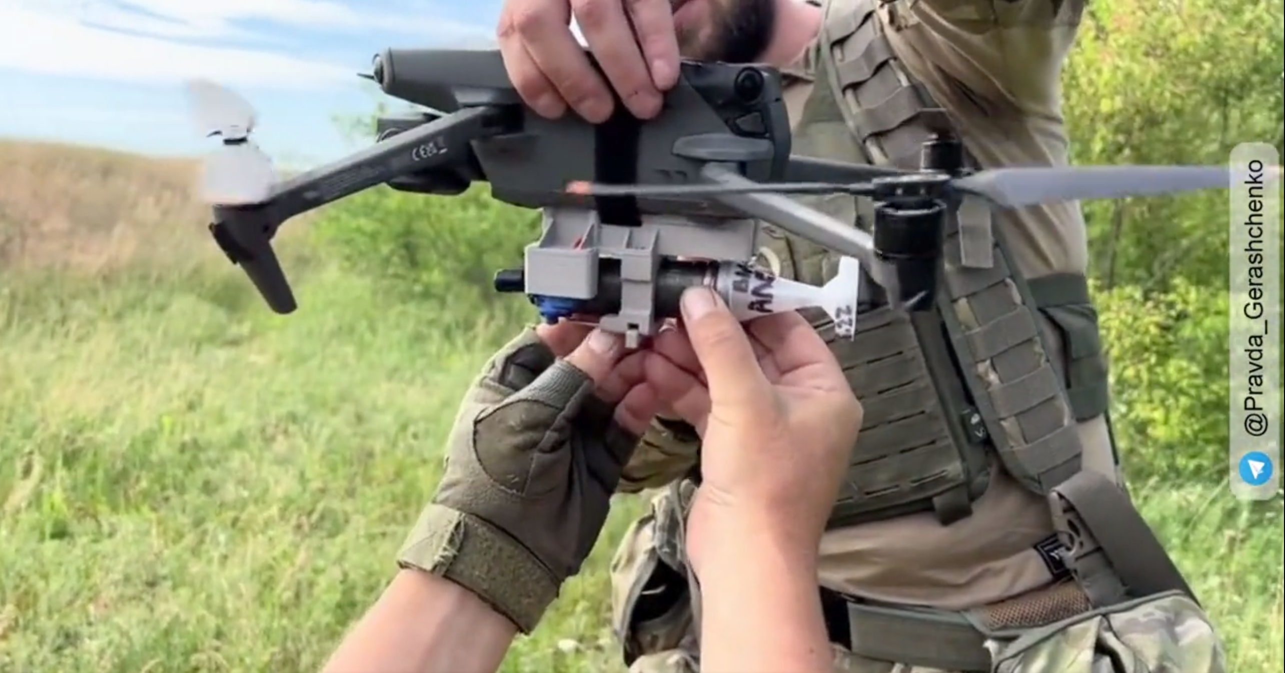 Hobbydrohnen lassen sich auch zu Mini-Bombern umbauen. Hier eine DJI Mavic-Drohne mit selbstgebauter Abwurfeinrichtung für eine VOG-17-Granate17.