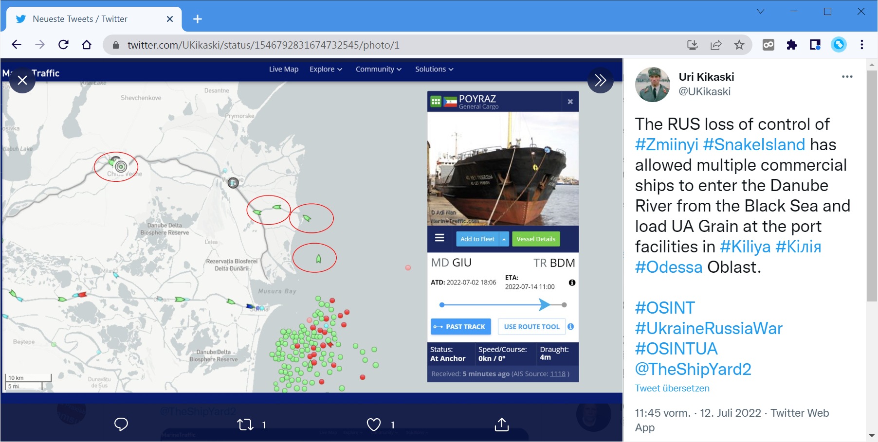Kommentar eines Bloggers zu einer Karte der Schiffsbewegungen (in der kommerziellen Seefahrt sind alle Schiffe mit einem Positionsmeldungssystem82 ausgestattet): »Der Verlust der Kontrolle über die Schlangeninsel durch Russland hat es vielen Handelsschiffen ermöglicht, vom Schwarzen Meer aus in die Donau einzufahren und Ukrainisches Getreide in den Hafenanlagen in Kiliya im Odessa-Oblast zu laden.«83