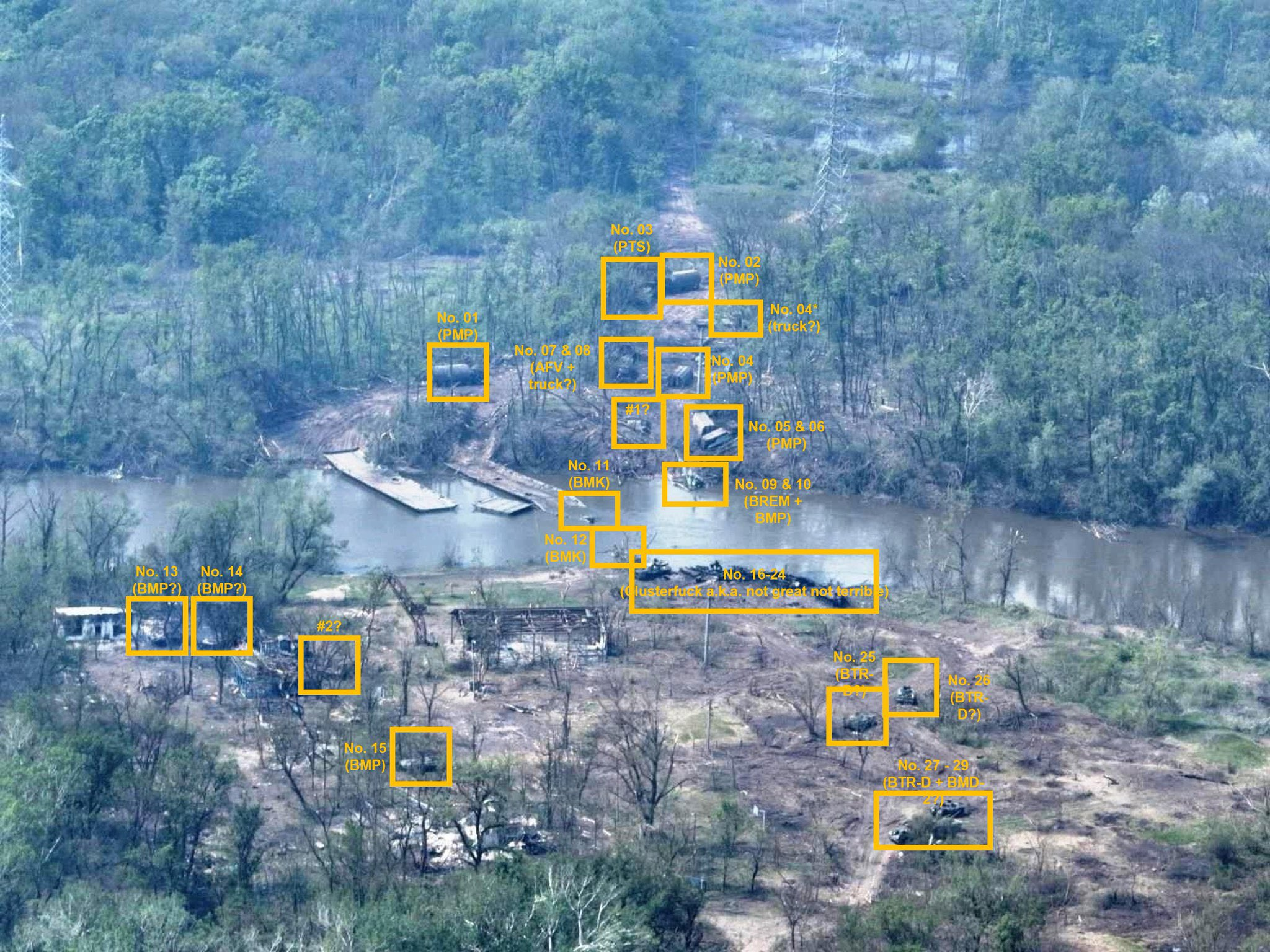 Beim ersten Querungsversuch am 5. Mai verloren die Russen ca. 15 Fahrzeuge und den Brückenkopf. Zu den folgenden Ereignissen am 8. Mai gibt es einen Augenzeugenbericht17 von einem ukrainischen Soldaten: