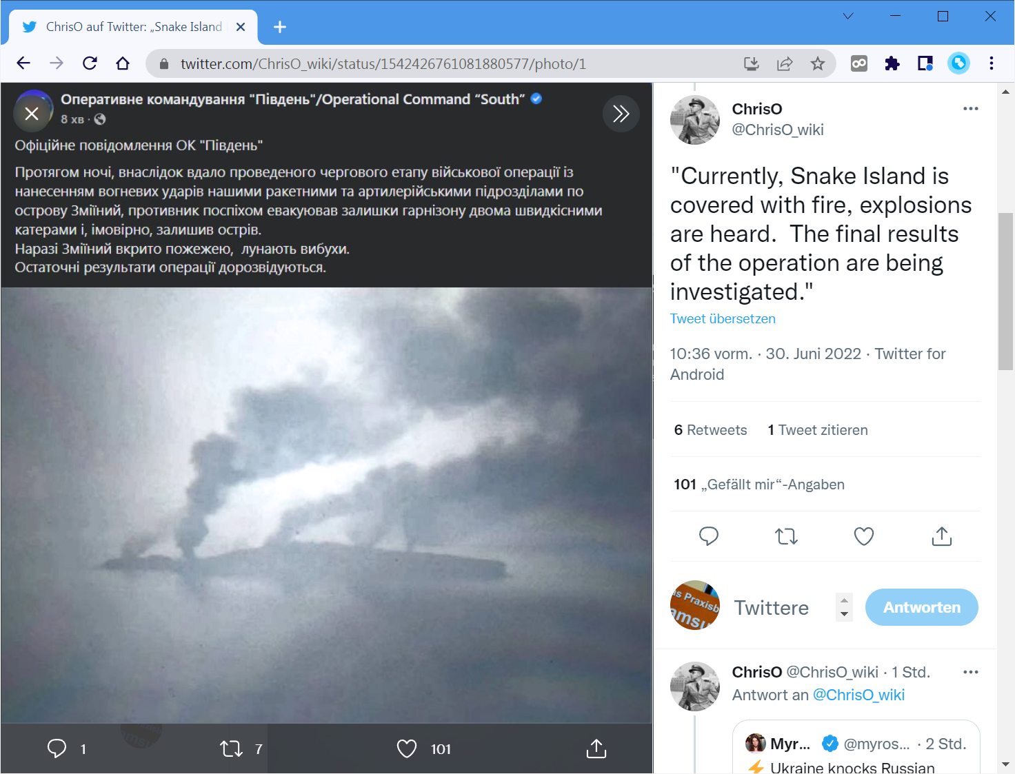 »Offizielle Nachricht des Einsatzkommandos 'Süd': In der Nacht, im Rahmen des erfolgreichen Abschlusses der nächsten Phase der Militäroperation, wurden durch unsere Raketen- und Artillerieeinheiten Schläge auf Zmiinyi [Schlangeninsel] durchgeführt. Der Feind evakuierte die Überreste der Garnison hastig mit zwei Schnellbooten und hat wahrscheinlich die Insel verlassen. Derzeit ist Zmiinyi mit Feuer bedeckt, Explosionen sind zu hören. Die Endergebnisse der Operation werden untersucht.«