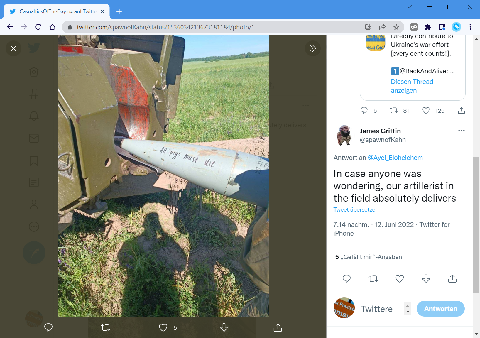 Beweisfoto: »Falls sich jemand wundert, unser Artillerist im Feld ist absolut zuverlässig (englisches Wortspiel: er liefert)«42. Die Beschriftung des Projektils im Foto lautet »All pigs musst die« (alle Schweine müssen sterben).