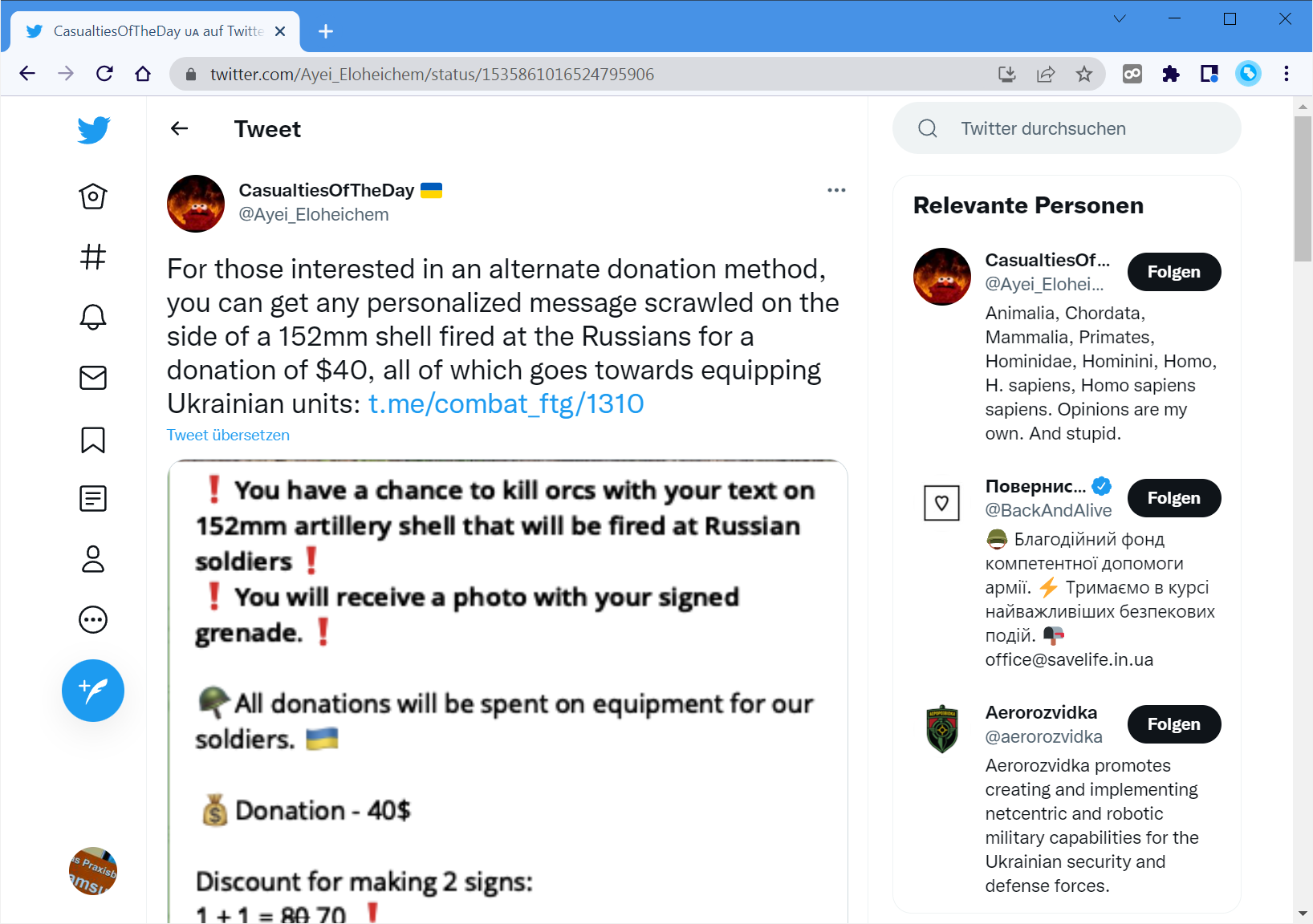 Eine kreative Aktion haben sich einige ukrainische Soldaten ausgedacht: Für eine Spende von 40 US-Dollar wird ein kurzer Text, den der Spender selbst wählen darf, auf ein anschließend verschossenes 152 mm-Projektil gemalt. Für 400 US-Dollar kann man auch eine BUK-Rakete beschriften lassen.