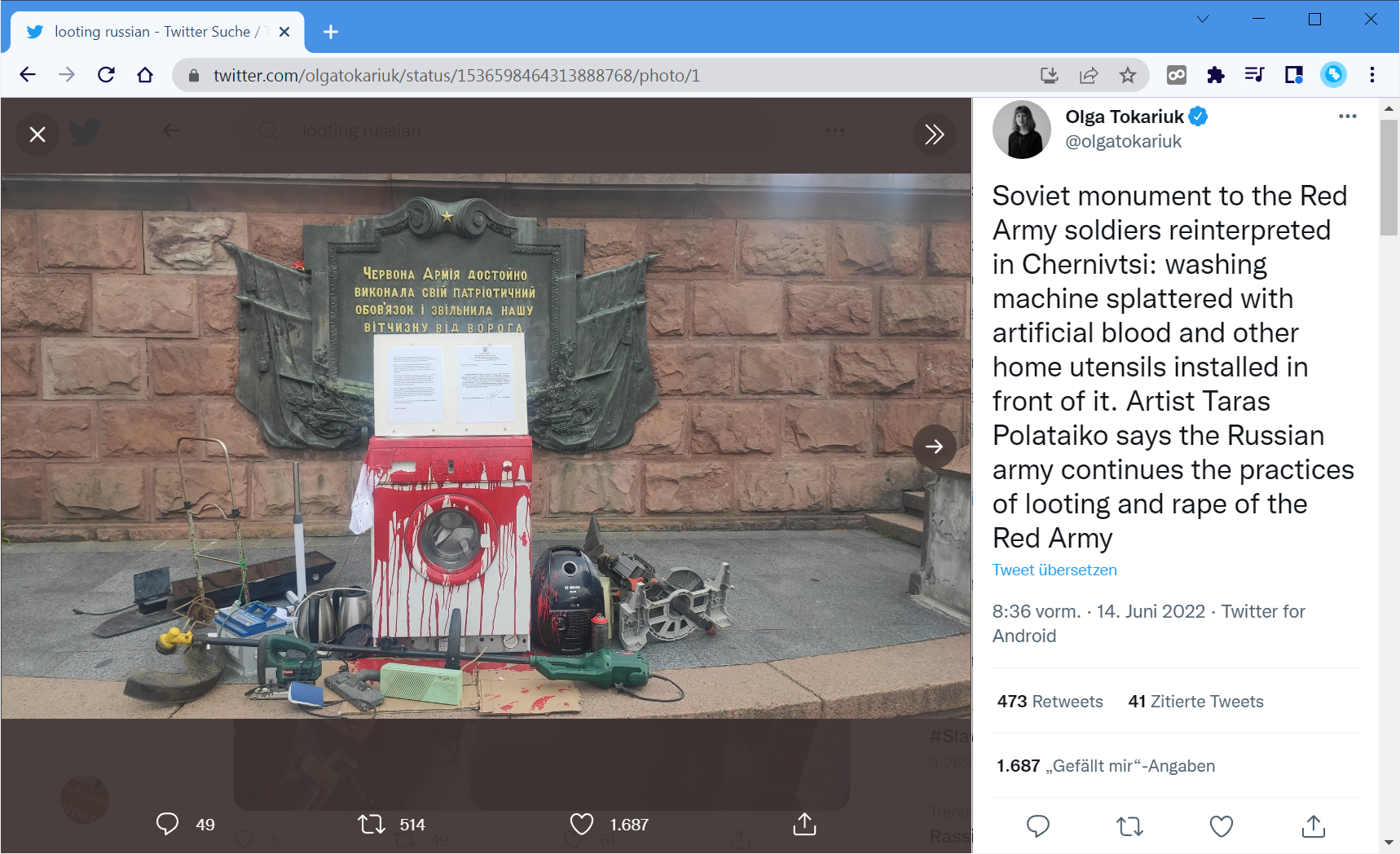 Dieses Denkmal aus der Sowjetzeit wurde »aufgewertet«15. In der Beschreibung heißt es dazu: »Das sowjetische Denkmal für die Soldaten der Roten Armee in Czernowitz wird neu interpretiert: eine mit Kunstblut bespritzte Waschmaschine und andere Haushaltsgeräte sind davor aufgestellt. Der Künstler Taras Polataiko sagt, die russische Armee setze die Praktiken der Plünderung und Vergewaltigung der Roten Armee fort«