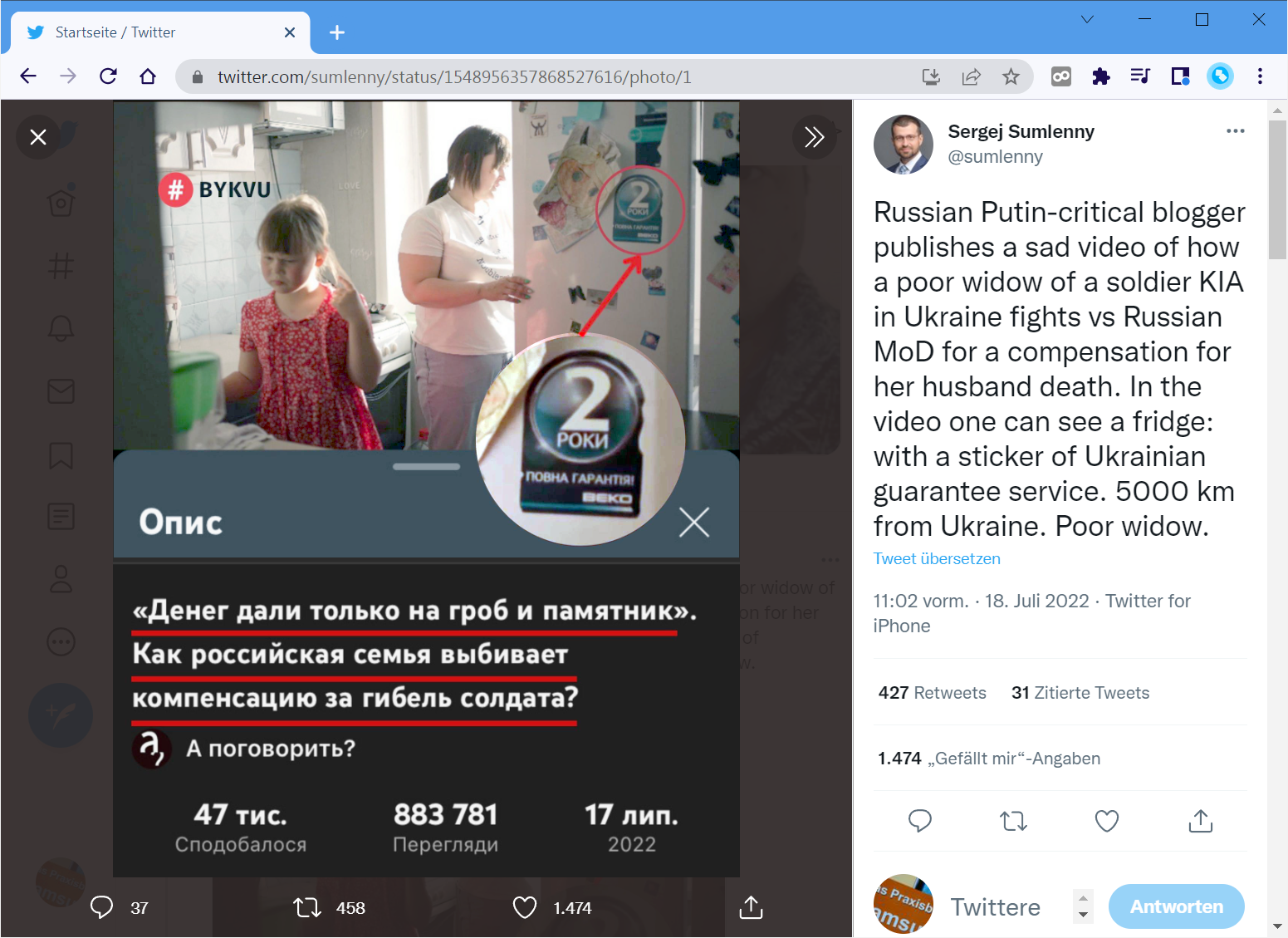 Beschreibung: »Ein russischer Putin-kritischer Blogger veröffentlicht ein trauriges Video darüber, wie eine arme Witwe eines in der Ukraine gefallenen Soldaten gegen das russische Verteidigungsministerium um eine Entschädigung für den Tod ihres Mannes kämpft. In dem Video ist ein Kühlschrank zu sehen: mit einem Aufkleber des ukrainischen Garantiedienstes. 5000 km von der Ukraine entfernt. Die arme Witwe.«21 (Hinweis: Laut dem Medium Ukrainska Pravda ist nicht der Ehemann, sondern der Stiefsohn gefallen22).