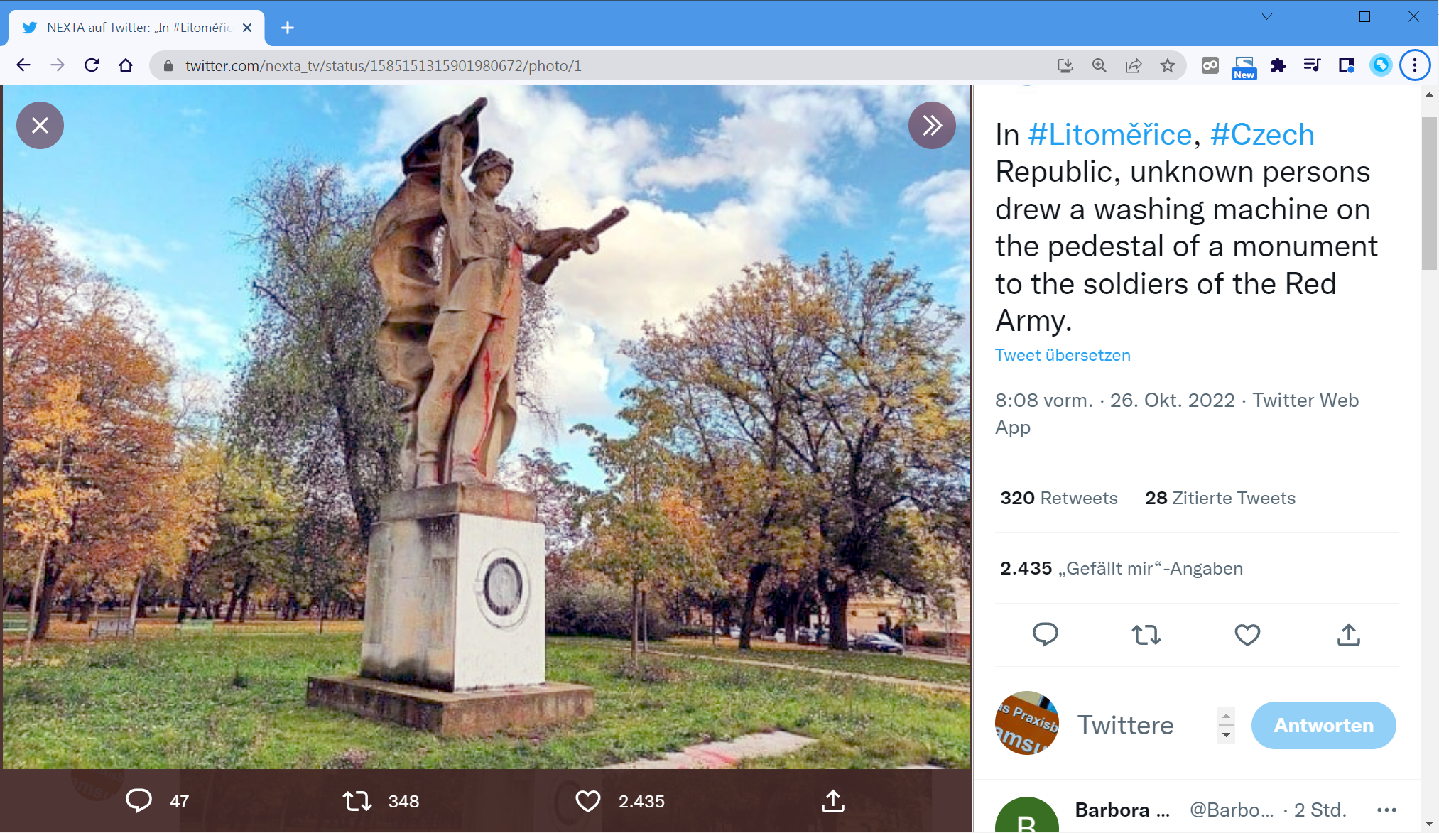 Ein weiteres kreativ verunstaltetes Denkmal: »In #Litoměřice, Tschechische Republik, haben Unbekannte eine Waschmaschine auf den Sockel eines Denkmals für die Soldaten der Roten Armee gezeichnet.«16